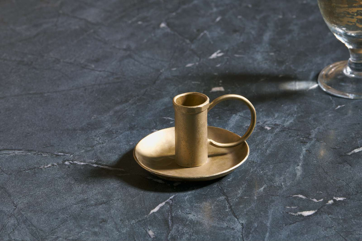 Candlelight creates a magical ambience and this individual Amiri iron candlestick brings a sense of nostalgia for a bygone age. The elegant design has a charming handle and dish and the antique brass tones add a warmth that will glow under a flickering flame