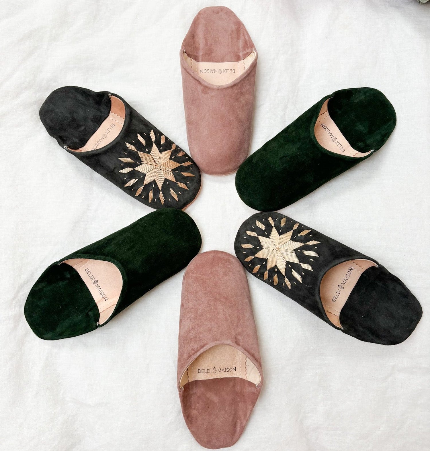 Made from the softest suede material which not only enhances comfort but also gives the slippers a sophisticated, matte finish, they are then finished with a beautiful gold coloured hand embroidered Moroccan geometric star design.
