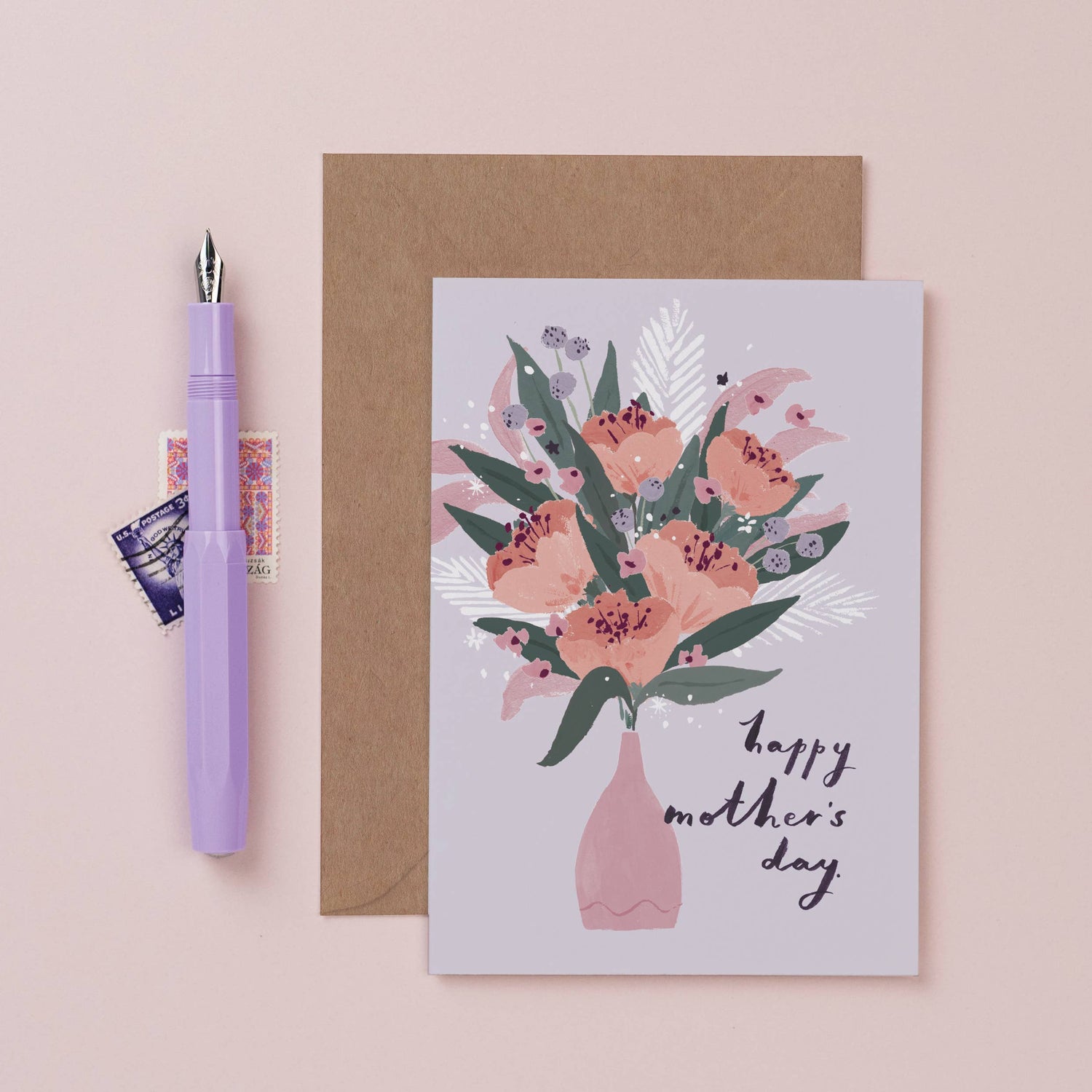 Mother's Day card with delicately painted artwork of beautiful flower arrangement in a vase. Mother's Day card with 100% recycled kraft envelope.