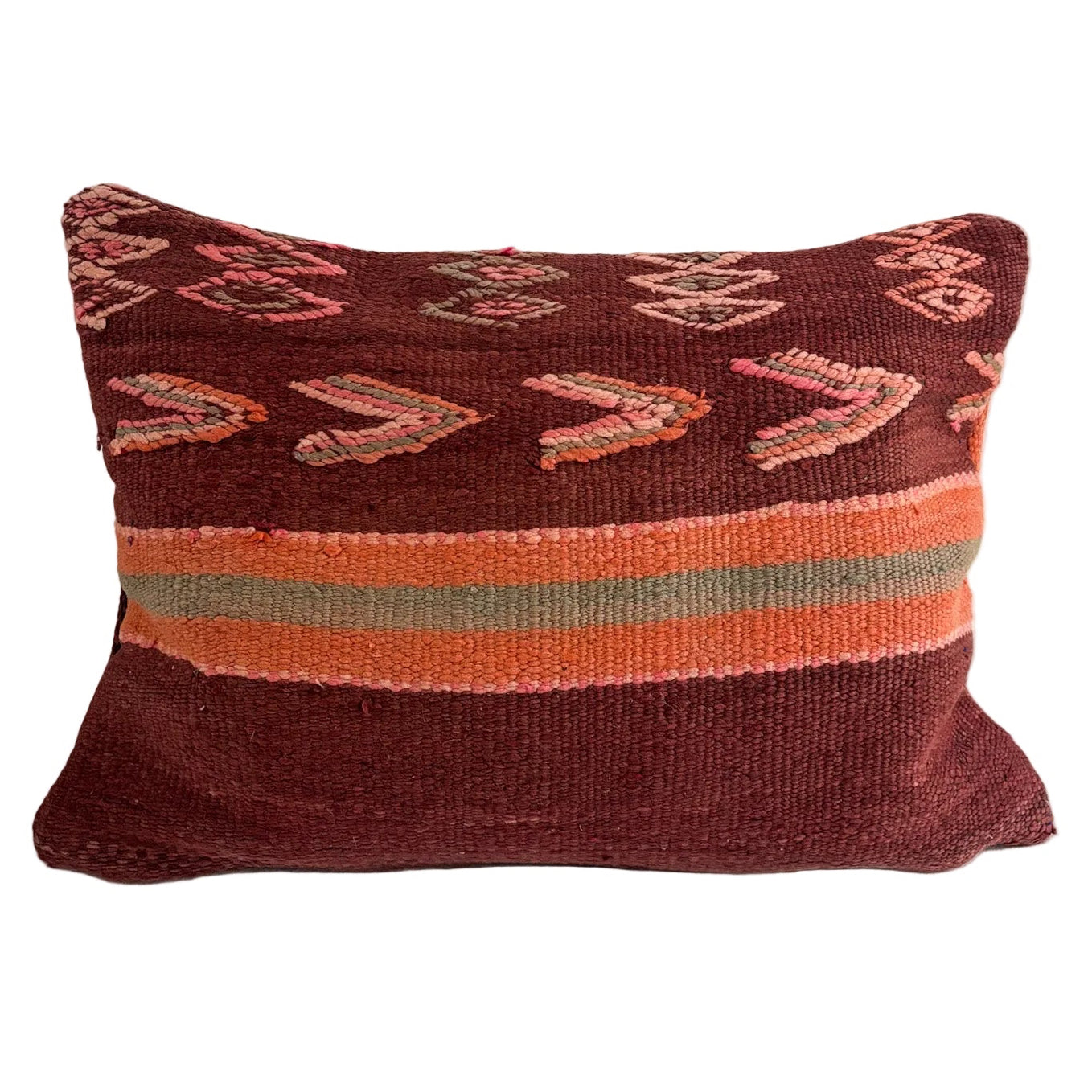 One side displays bold woven motifs in soft pink, coral, and charcoal on a rich berry-toned base, adding warmth and expressive character to your space.