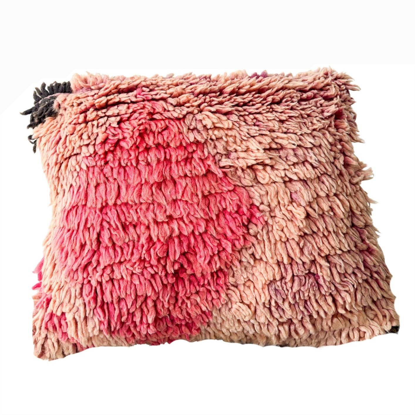 This unique cushion has been crafted from a vintage Moroccan rug, giving it a second life as a one-of-a-kind home accessory. Made from soft wool with a deep shaggy pile, it combines the playful, colourful spirit of Boucherouite weaving with the rich texture and tones typical of Beni Mguild rugs.