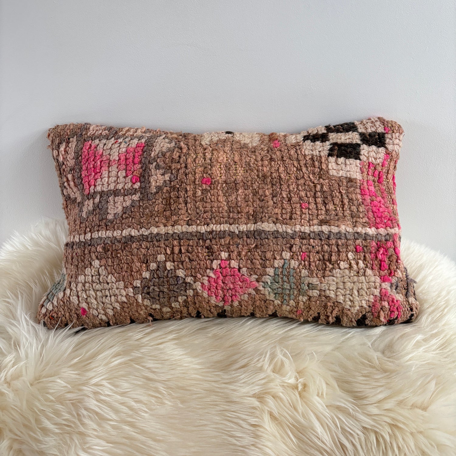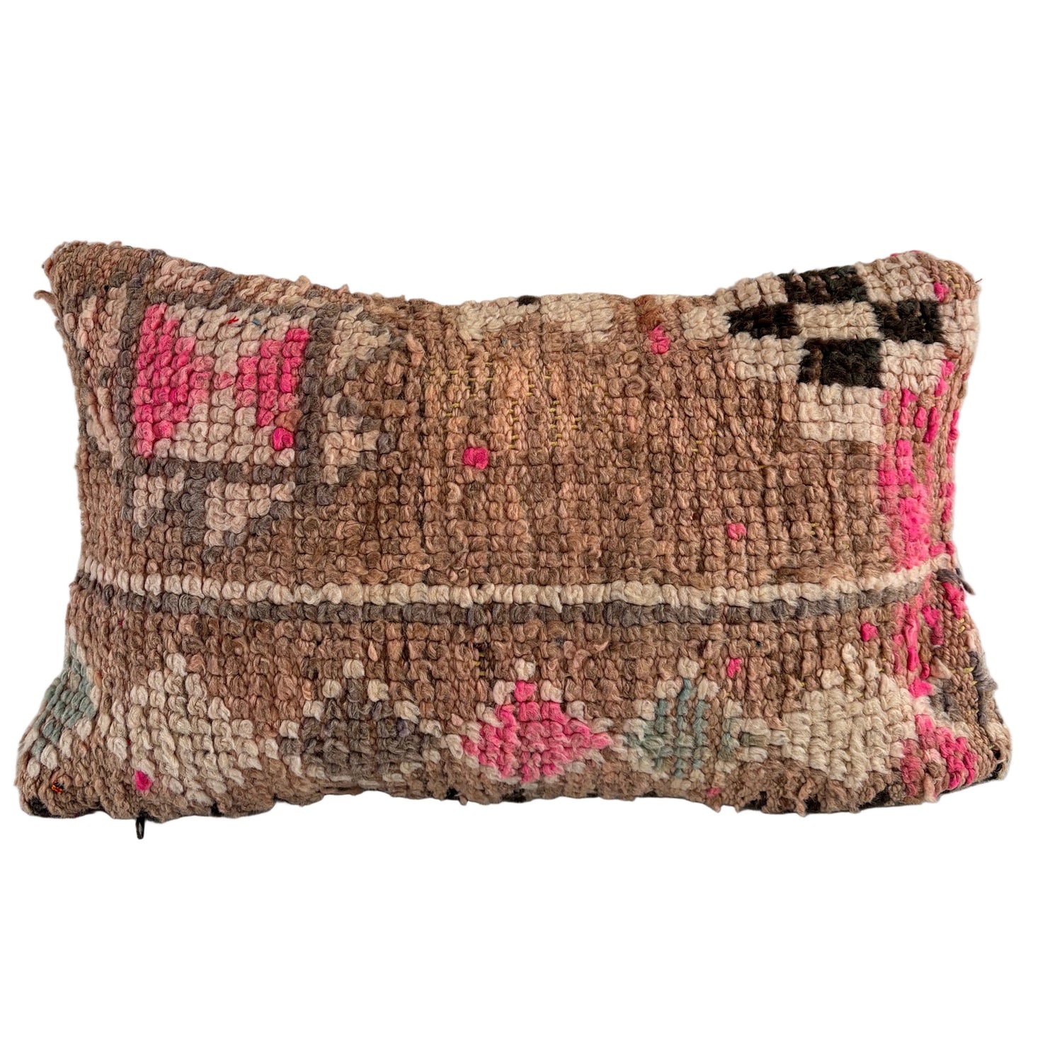 This beautiful cushion is made from a vintage Moroccan Boujaad rug, traditionally handwoven by Berber artisans in the Atlas Mountains. Boujaad textiles are known for their soft, plush wool pile, expressive motifs, and warm, earthy tones—each piece carrying its own unique story and character.