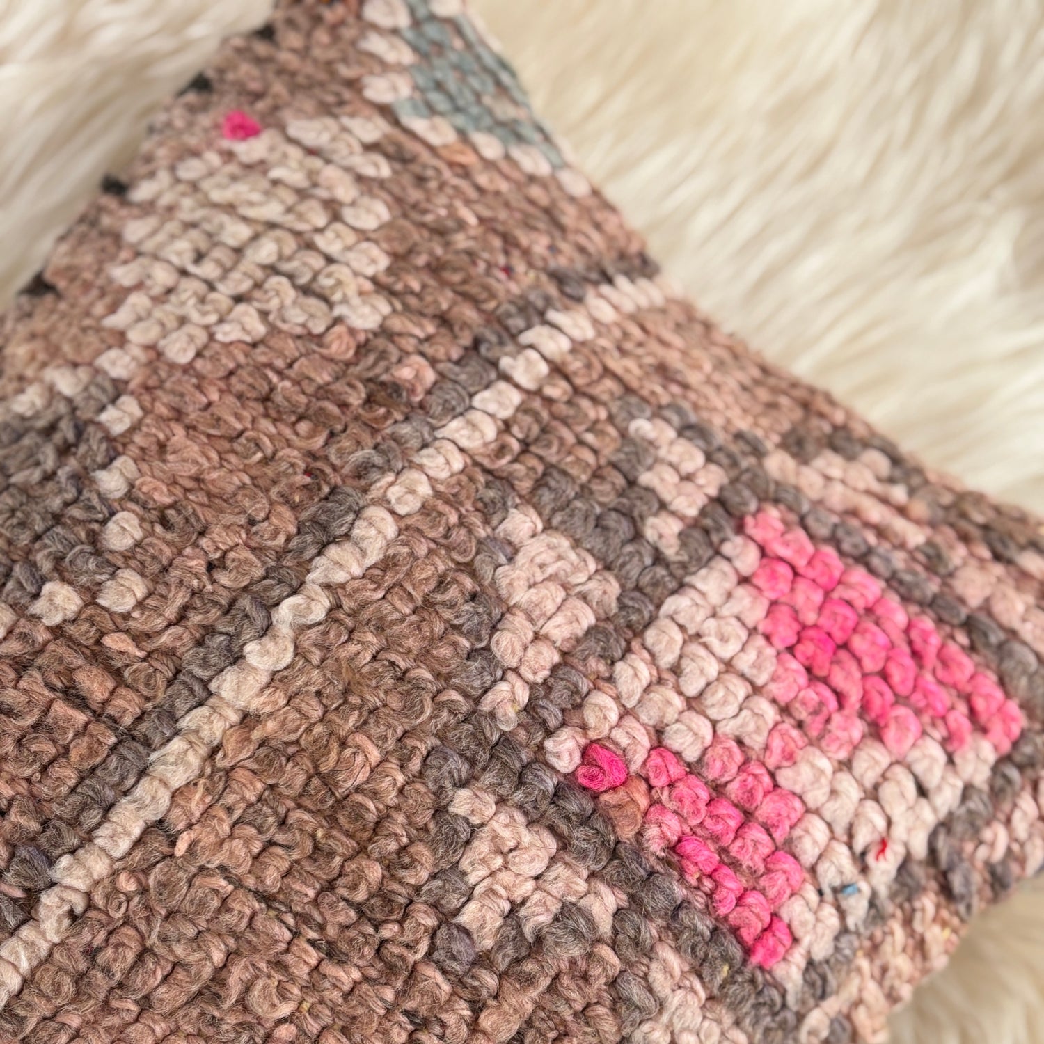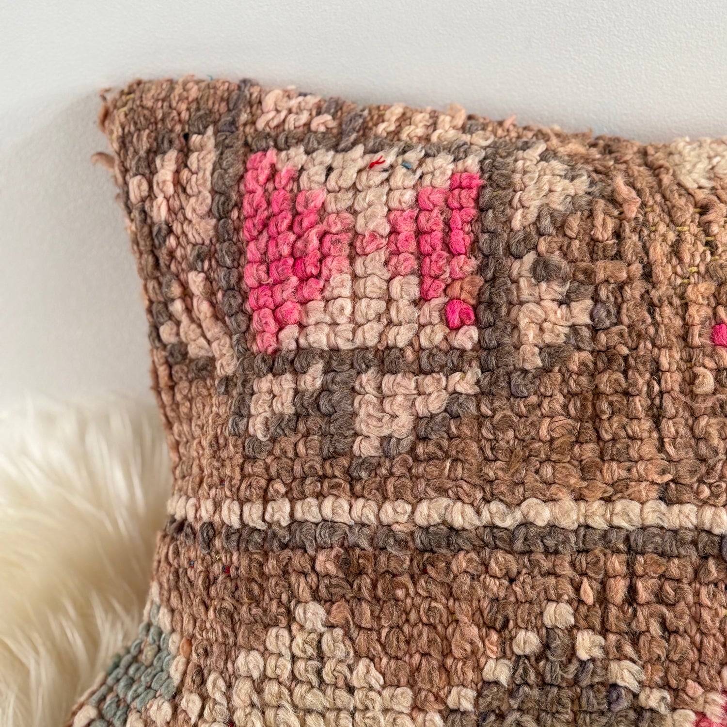 This cushion features a rich palette of taupe, sand, and mocha tones, accented with pops of pink, charcoal, and muted teal. The hand-knotted pile gives it a cosy, tactile texture, while the organic patterning adds depth and a soulful, bohemian charm to any interior.